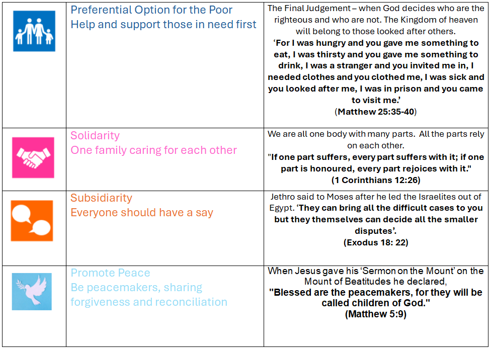 There are also many areas of daily school life that we have identified that demonstrates how we reinforce and explicitly teach the children about the CST Principles. For example: Forest Schools, Lenten Charity action, being a Rights Respecting School, music lessons, Sports Clubs, Residential trips, French Exchange, creation of Class Charters, visits from the Royal British Legion for Remembrance and many more.